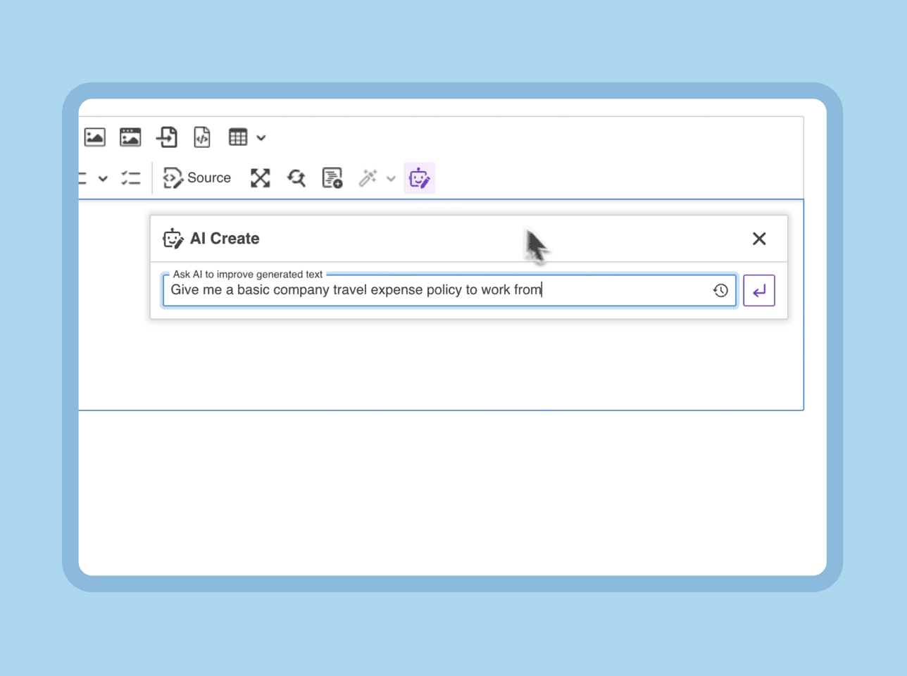 AI Create integrates seamlessly into the ThoughtFarmer editor in the same space you already work to create content. A tool that sits quietly within your workspace, ready to spring into action with a simple click on the toolbar.