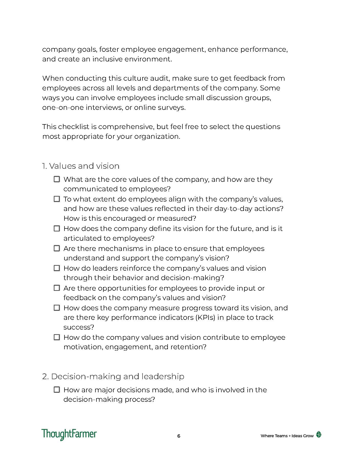By asking the following questions related to the 8 principles of corporate culture and taking action based on your company’s feedback, you can better align your workforce with your company goals, foster employee engagement, enhance performance, and create an inclusive environment.”